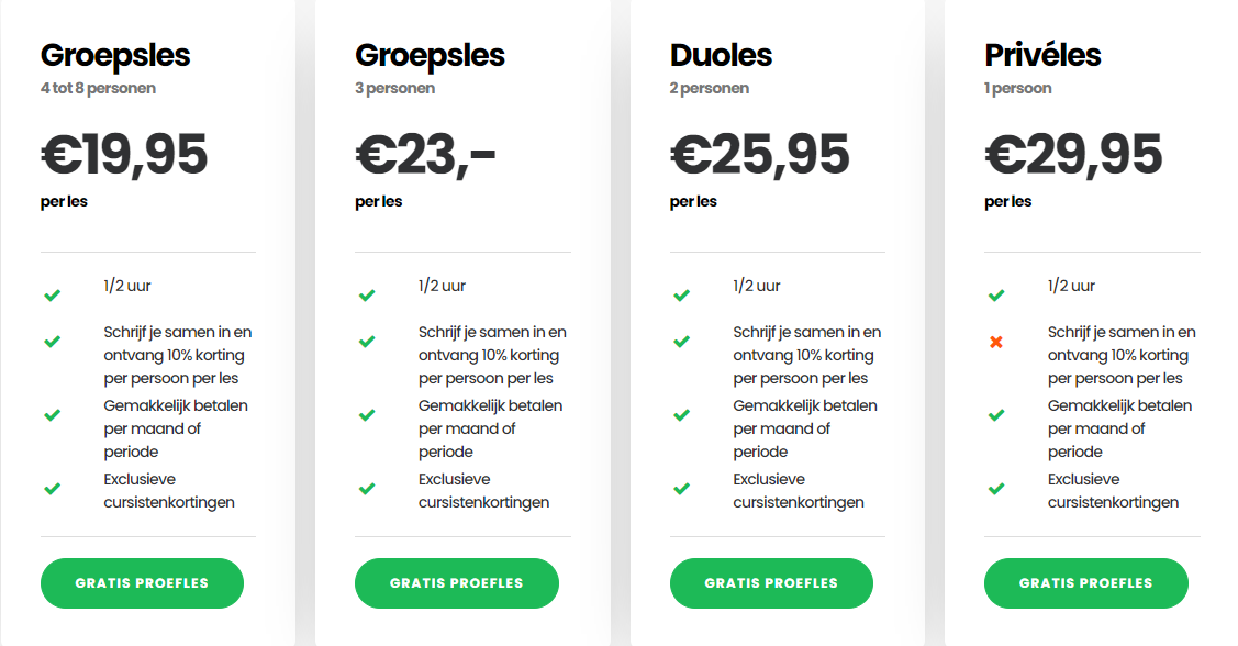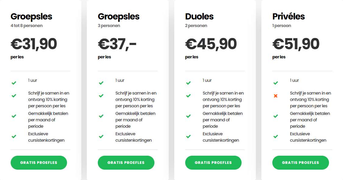 • Later voordeel ervaren doordat als je in totaal 24 lessen hebt gevolgd, je alsnog automatisch overgaat op het voordeligere tarief van het 24-lessenpakket.